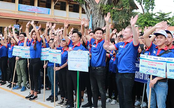 | Các sinh viên tình nguyện hồ hởi trong lễ ra quân “Tiếp sức mùa thi” 2018 tổ chức sáng 16-6 tại ĐH Sài Gòn. Ảnh: M.Tâm |