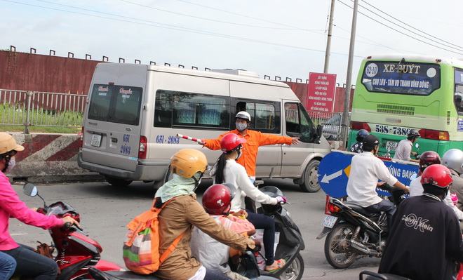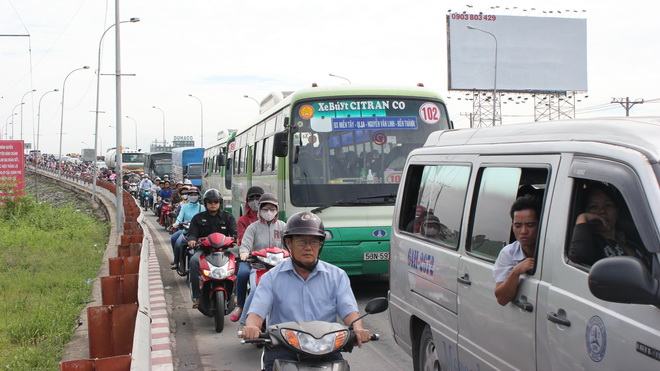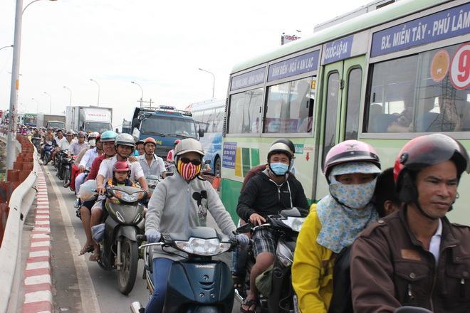 Khoảng 9g, lượng xe máy hướng từ TP.HCM tới Long An tăng đột biến khiến việc qua cầu theo hướng này rất khó khăn. Xe cộ ùn ứ, di chuyển chậm qua cầu. Lực lượng thanh niên xung phong và nhân viên của đơn vị thi công phải đứng ra điều tiết giao thông tại các đầu cầu và các giao lộ.
