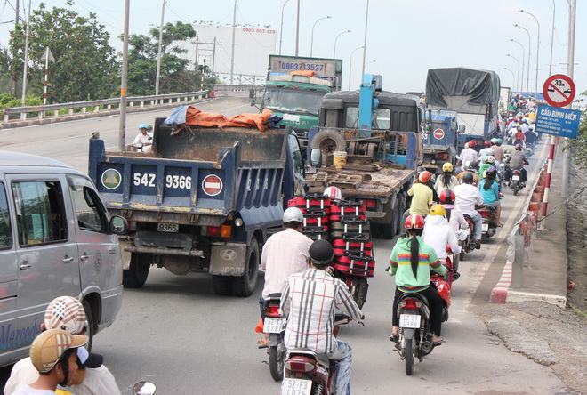Sáng 1-7 đơn vị sửa chữa cầu Bình Điền do Khu Quản lý giao thông đô thị số 4 thuộc Sở Giao thông vận tải TP.HCM làm chủ đầu tư đã cho máy khoan bóc lớp nhựa bêtông một số vị trí tại nhánh 2 cầu Bình Điền (đã được rào chắn và cấm các xe qua cầu). Xe cộ ở cả hai hướng phải chia sẻ diện tích nhỏ hẹp của nhánh 1 cầu Bình Điền khiến việc qua đây gặp khá nhiều khó khăn.