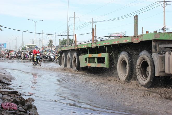 Theo ghi nhận, mặt quốc lộ 1A đọng nước cũng góp phần cản trở việc đi lại của các xe qua đây.
