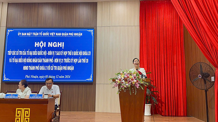 Chiều 5-12, Tổ đại biểu Quốc hội (ĐBQH) TP.HCM Đơn vị 7 gồm đại biểu: Phạm Khánh Phong Lan – Giám đốc Sở An toàn thực phẩm TP.HCM, Ủy viên Ủy ban Về các vấn đề xã hội của Quốc hội; Nguyễn Minh Hoàng – Thiếu tướng, nguyên Phó Chính ủy Quân khu 7, Ủy viên Ủy ban Quốc phòng và An ninh của Quốc hội; Phan Thị Thanh Phương – Thành ủy viên, Bí thư Quận ủy Phú Nhuận đã có buổi tiếp xúc cử tri, báo cáo về nội dung kỳ họp thứ 8 Quốc hội khóa XV…
