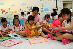 Giáo viên Trường Mầm non Họa Mi 3 (Q.5) đang cùng chơi với các cháu lớp Chồi. Ảnh: Anh Khôi
