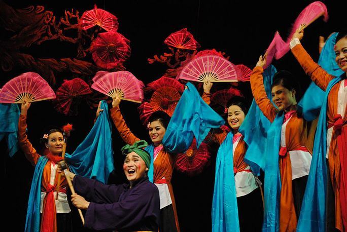 NSƯT Xuân Hinh (nam) trong một trích đoạn chèo cổ cùng với dàn diễn viên nữ Nhà hát Chèo Việt Nam. Ảnh: Minh Luân