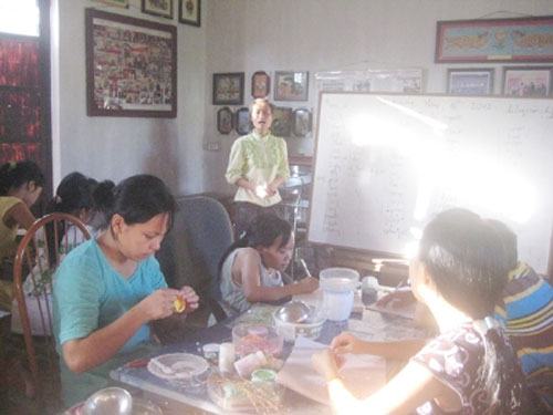 Lớp học đặc biệt ở chỗ học viên ngồi xen kẽ cùng với những người đang làm sản phẩm thủ công. Vì thế, không chỉ người học mà ngay cả người làm cũng có thể tiếp thu được tiếng Anh.
