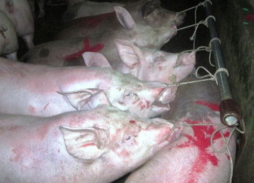 Theo nhận định của cơ quan chức năng, hành vi vi phạm của các lò mổ ngày càng tinh vi, không sử dụng dụng cụ bơm thủ công như trước đây mà dùng mô tơ kết hợp với dụng cụ tự chế bơm cùng lúc hàng chục con heo. Sau khi heo được khớp miệng treo lên thành chuồng (ảnh), ống nhựa tự chế được đưa vào bao tử heo rồi đóng điện cho mô tơ bơm nước. Thời gian mà các lò mổ thực hiện từ 0 – 3 giờ nên khó phát hiện.