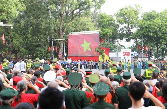 Nghi thức chào cờ thiêng liêng diễn ra trong tiếng Quốc ca hùng tráng đồng thanh của hàng triệu người có mặt tại Quảng trường Ba Đình, trên đường phố Hà Nội cũng như mọi miền Tổ quốc, từ Bắc vào Nam đến hải đảo xa xôi kết nối trực tuyến với buổi lễ. Cùng lúc đó, 21 loạt đại bác khai hỏa tại Sân vận động quốc gia Mỹ Đình, Hà Nội.