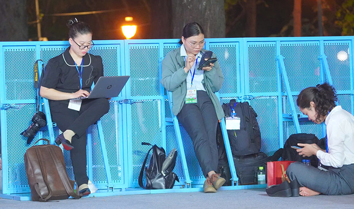 Nhiều đồng nghiệp tới trước đã “xí” những vị trí tác nghiệp tốt nhất, đa số đều chuẩn bị máy ảnh xịn xò, có người mang theo thang, người chuẩn bị gậy chụp ảnh. Tất cả đều sẵn sàng tác chiến trong đại lễ. Dù vậy vài phóng viên cũng lộ vẻ lo lắng và “xi nhan” với nhau: “Lỡ xíu tôi không chụp được ảnh nhớ cho xin với nha. Nếu không tôi sẽ không hoàn thành nhiệm vụ”.
