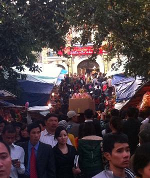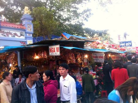 Chen lấn toát mồ hôi, úp mặt vào mông người khác mãi rồi tôi cũng lên tới sân đền, có lẽ chả nơi nào bát nháo như ở đây. Hàng rong, đổi tiền lẻ, bán sách tử vi, tướng số, vàng mã la liệt khắp sân. Do có quá nhiều người đặt lễ nên nhà đền đã đặt hẳn một cái sạp nhiều tầng giữa sân đền để con nhang đệ tử có chỗ mà “dâng tấm lòng thành”.