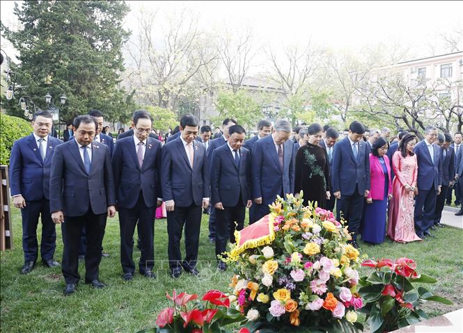 Tổng Bí thư, Chủ tịch nước Tô Lâm và Phu nhân với các đồng chí lãnh đạo Đảng, Nhà nước dâng hoa Chủ tịch Hồ Chí Minh trong khuôn viên Đại sứ quán. Ảnh: Thống Nhất/TTXVN