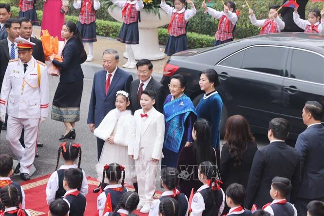 Đoàn xe dừng tại thảm đỏ, trong tiếng nhạc chào mừng, Tổng Bí thư Tô Lâm và Phu nhân bắt tay, chào đón Tổng Bí thư, Chủ tịch nước Lào Thongloun Sisoulith và Phu nhân thăm cấp Nhà nước đến Việt Nam. Các học sinh cũng gửi tới Tổng Bí thư, Chủ tịch nước Lào cùng Phu nhân những bó hoa tươi thắm.