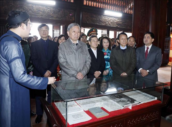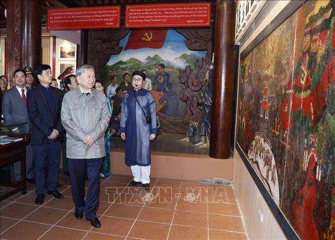 Ngay sau lễ dâng hương, Tổng Bí thư Tô Lâm cùng Đoàn đại biểu đã thăm quan khu trưng bày tư liệu, hiện vật, Nhà lưu niệm – nơi gắn bó những năm tháng tuổi thơ của Tổng Bí thư Nguyễn Văn Cừ.