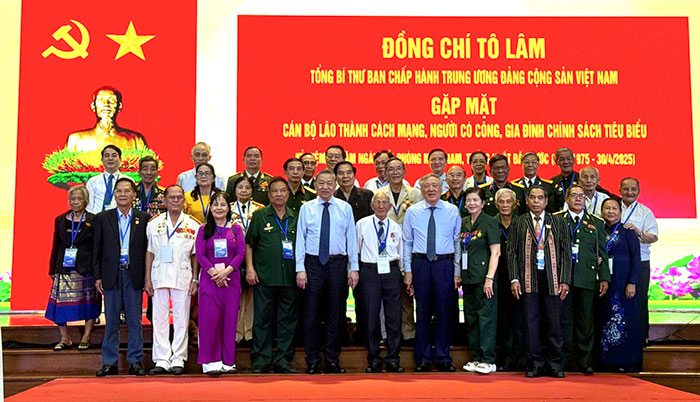 Tổng Bí thư Tô Lâm khẳng định, sau 50 năm giải phóng hoàn toàn miền Nam, thống nhất đất nước và gần 40 năm thực hiện công cuộc đổi mới, đất nước ta đã giành được nhiều thành tựu to lớn và có ý nghĩa lịch sử, trong đó có đóng góp quan trọng của các đại biểu tham dự buổi gặp mặt hôm nay. Thế hệ hôm nay và cả về sau này mãi mãi tri ân lớp lớp thế hệ cha anh đã hiến dâng máu xương vì độc lập của dân tộc và sự giúp đỡ quý báu của bạn bè quốc tế.