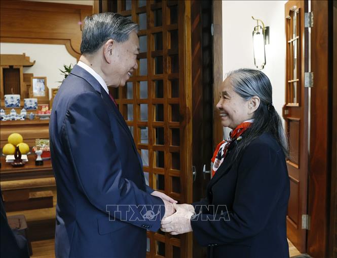 Tổng Bí thư Tô Lâm thăm hỏi Phu nhân Tổng Bí thư Nguyễn Phú Trọng. Ảnh: Thống Nhất/TTXVN