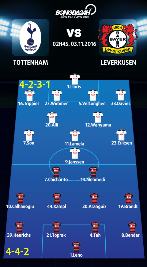 Trận Tottenham vs Bayer Leverkusen, về mặt lực lượng, đội chủ nhà sẽ đón chào sự trở lại của tiền đạo Harry Kane, nhưng khả năng anh đá chính là không cao. Toby Alderweireld không kịp bình phục còn khả năng ra sân của Erik Lamela cũng đang bỏ ngỏ do bị ốm. Bên kia chiến tuyến, Leverkusen cũng đang không có phong độ cao trong thời gian gần đây. Trong 5 trận gần nhất họ chỉ thắng được 1 trận và phải nhận tới 2 trận thua. Hiện tại, đội chủ sân Bay Arena đang xếp thứ 10 trên bảng xếp hạng Bundesliga với 13 điểm sau 9 trận, NHM đội bóng này có lý do để không hài lòng với thứ hạng hiện tại của đội bóng.