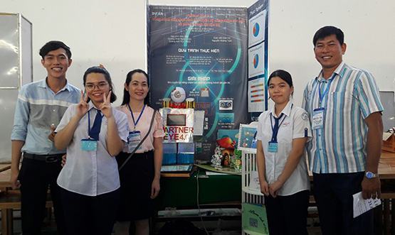 Hai tác giả và giáo viên hướng dẫn của sản phẩm “Partner Eye 4.0” đồng hành cùng học sinh rèn luyện kỹ năng chăm sóc mắt và phòng tránh tật cận thị” chụp hình lưu niệm cùng Ban giám khảo