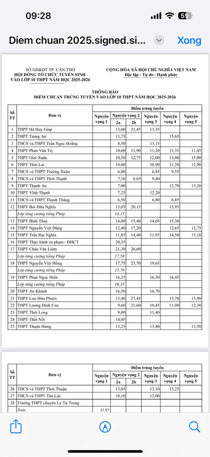 Sở Giáo dục và Đào tạo (GD-ĐT) TP.Cần Thơ vừa công bố điểm chuẩn và kết quả trúng tuyển kỳ thi tuyển sinh lớp 10 THPT năm học 2025-2026.