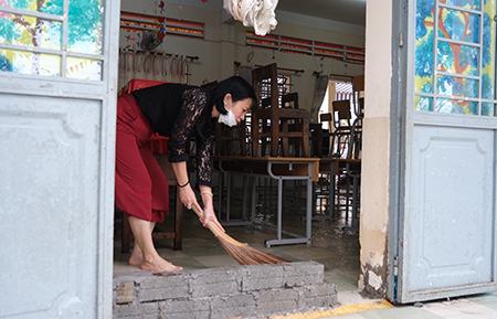 Dù nhiều trường đã xây các hàng gạch trước cửa các lớp để ngăn nước, nhưng nước vẫn tràn vào. Trong ảnh: Cô giáo quét dọn lớp sau khi nước rút