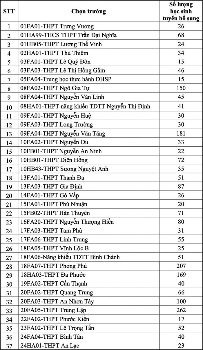 Trong danh sách 37 trường THPT tuyển bổ sung, nhiều trường có nhu cầu tuyển bổ sung lên đến trên 200 chỉ tiêu: THPT Trung Lập với 262 chỉ tiêu; THPT Phong Phú 207 chỉ tiêu.
