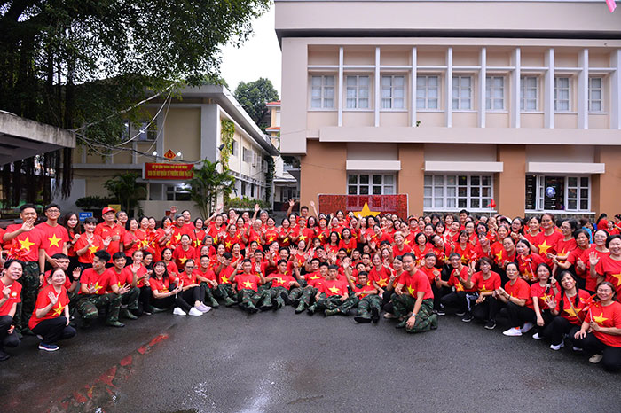 750 người trong trang phục cờ đỏ sao vàng tham gia đồng diễn tại trụ sở UBND phường Bình Thạnh