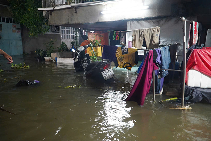 Khuya 24-10, nước sông dâng cuồn cuộn, len lỏi qua từng con hẻm nhỏ ở Bình Quới. Cả xóm chìm trong nước, người dân lội bì bõm giữa bóng đêm để cứu đồ, bơm nước, canh điện.