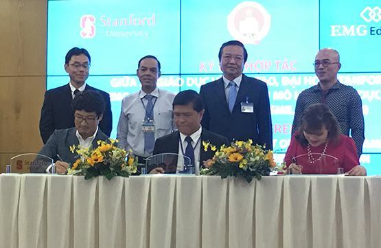 | Đại diện 3 đơn vị: Sở GD-ĐT TP.HCM, Công ty EMG Education và Trường Giáo dục sau ĐH (ĐH Stanford) ký kết hợp tác. Ảnh: L.Vy |