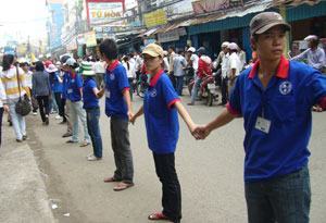 Sinh viên tình nguyện lập hàng rào phân luồng, tránh ùn tắc giao thông vào giờ cao điểm thí sinh thi xong tại Trường ĐH Công nghiệp TP.HCM trong mùa tuyển sinh ĐH, CĐ 2012 |