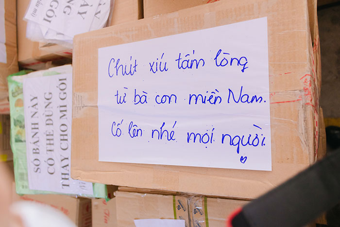 Những thùng quà được dán dòng chữ giản dị “Gửi một chút yêu thương” – thay lời nhắn của người dân TP.HCM gửi tới bà con miền Trung và miền Bắc đang chịu nhiều mất mát.