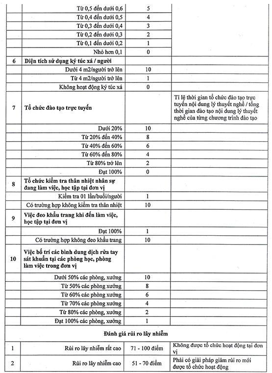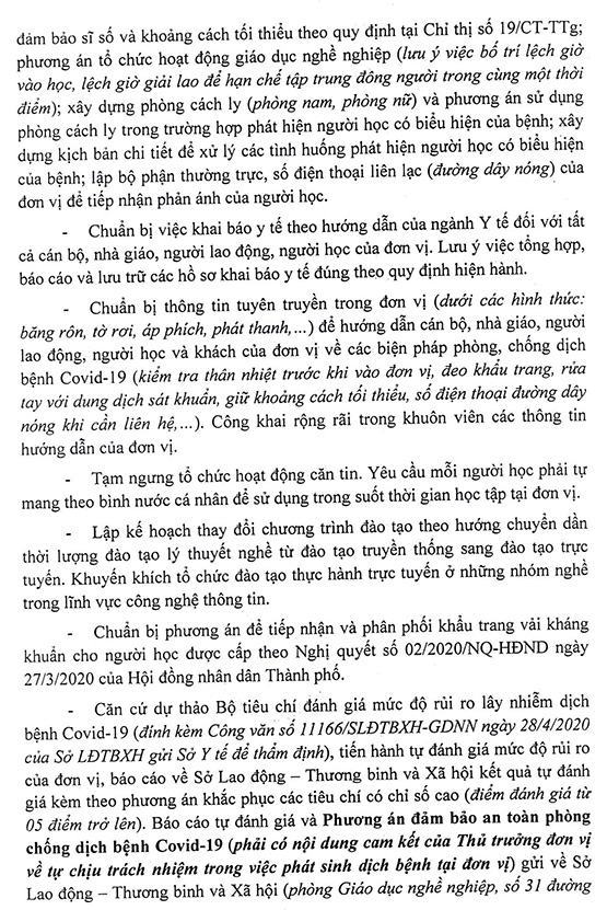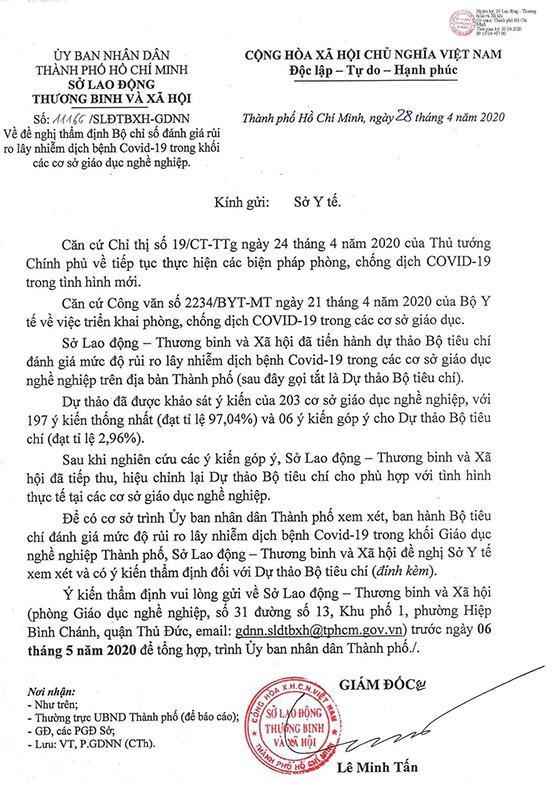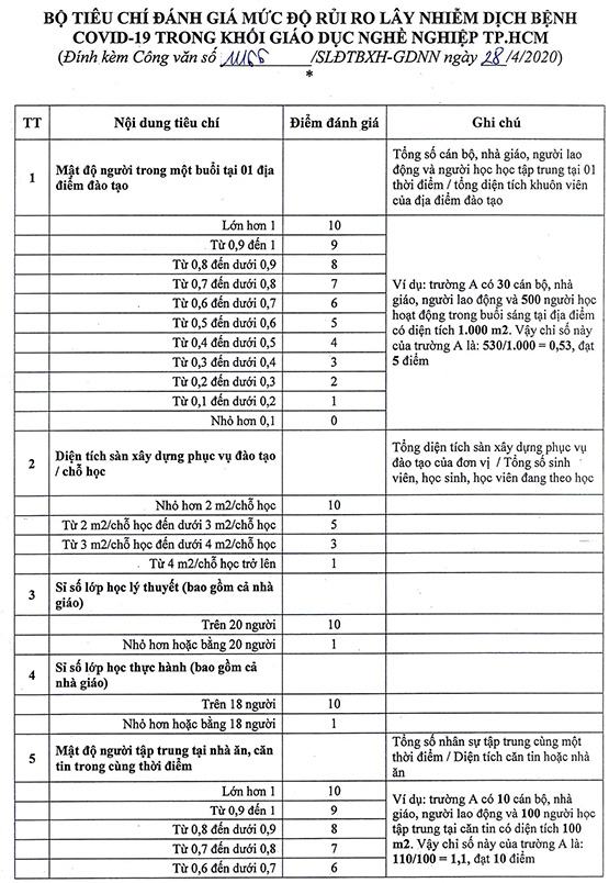 Căn cứ dự thảo Bộ tiêu chí đánh giá mức độ rủi ro lây nhiễm dịch bệnh Covid-19 (đính kèm Công văn số 11166/SLĐTBXH-GDNN ngày 28/4/2020 của Sở LĐTBXH gửi Sở Y tế để thẩm định), tiến hành tự đánh giá mức độ rủi ro của đơn vị, báo cáo về Sở LĐ-TB&XH kết quả tự đánh giá kèm theo phương án khắc phục các tiêu chí có chỉ số cao (điểm đánh giá từ 5 điểm trở lên). Báo cáo tự đánh giá và Phương án đảm bảo an toàn phòng chống dịch bệnh Covid-19 (phải có nội dung cam kết của Thủ trưởng đơn vị về tự chịu trách nhiệm trong việc phát sinh dịch bệnh tại đơn vị) gửi về Phòng GDNN-Sở LĐ-TB&XH trước 17g ngày 5-5. Sau hạn trên, nếu đơn vị không phản hồi xem như đơn vị chưa đủ an toàn trong phòng chống dịch bệnh Covid-19 để tổ chức hoạt động GDNN, Sở LĐ-TB&XH sẽ tiến hành đình chỉ hoạt động GDNN của đơn vị theo quy định.