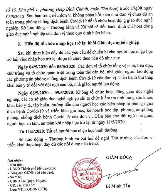 Chiều 29-4, Sở LĐ-TB&XH TP.HCM có công văn gửi các trường CĐ-TC-Trung tâm GDNN-GDTX và Thủ trưởng các cơ sở giáo dục nghề nghiệp (GDNN) về việc triển khai kế hoạch nhập học trở lại của HS-SV, học viên trên địa bàn.