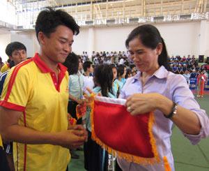 Bà Trần Thị Kim Thanh, Phó giám đốc Sở GD-ĐT TP.HCM tặng cờ lưu niệm cho các đội tham gia hội thao |