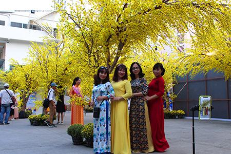 1.Những ngày này, ai đi qua khu vực Nhà văn hóa Thanh niên TP.HCM sẽ thấy được không khí tràn ngập sắc xuân với hơn 100 gốc mai bao phủ mặt tiền Phạm Ngọc Thạch và trong sân 4A của nhà văn hóa. Nơi đây đang diễn ra Lễ hội Tết Việt với chủ đề “Vui xuân an toàn”, khai mạc từ ngày 16-1 và kéo dài đến ngày 5-2 (tức nhầm ngày 14 đến 29 tháng chạp). Mỗi ngày có hàng trăm lượt khách đến vui xuân, chụp ảnh dưới không gian: Phố ông đồ, không gian vườn mai, góc chợ nổi trên không… Bên cạnh hoạt động vui chơi, trong khuôn khổ lễ hội còn các chương trình chăm lo Tết cho những người bị ảnh hưởng bởi dịch Covid-19: “Chuyến xe mùa xuân”; “Sinh viên đón Tết xa nhà”; “Chuyến xe sum vầy”… làm ngày Tết thêm ấm áp, nghĩa tình, đoàn viên.