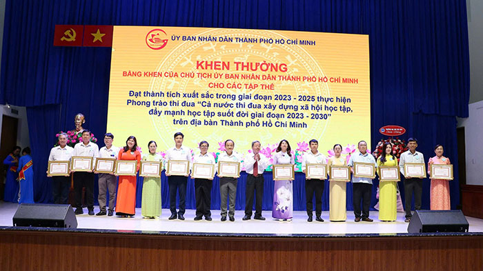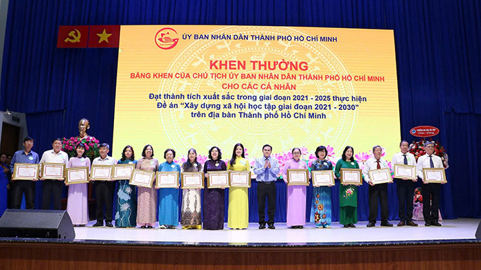 Dịp này, UBND TP.HCM đã trao bằng khen của Chủ tịch UBND TP cho 22 tập thể và 18 cá nhân có thành tích xuất sắc trong giai đoạn 2021-2025 thực hiện Đề án “Xây dựng xã hội học tập giai đoạn 2021-2030” trên địa bàn TP.HCM; 33 tập thể và 16 cá nhân có thành tích xuất sắc trong giai đoạn 2023-2025 thực hiện phong trào thi đua “Cả nước thi đua xây dựng xã hội học tập, đẩy mạnh học tập suốt đời giai đoạn 2023-2030” trên địa bàn TP.HCM.