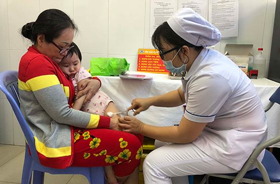 PH đưa trẻ tiêm vắc-xin ngừa sởi tại trạm y tế. Ảnh: N.N