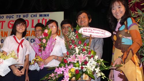 | Đồng nghiệp và học trò tặng hoa chúc mừng thầy Lương Anh Văn, giáo viên Trường THCS Nguyễn Gia Thiều, Q.Tân Bình, TP.HCM – một trong 37 nhà giáo ưu tú vừa được phong tặng năm 2010 – Ảnh: H.HG. |