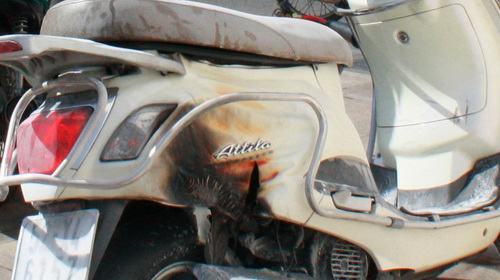 Tại hiện trường, chiếc xe gắn máy bị cháy sém phần phía sau. Dàn mủ nhựa phía bên ngoài cũng bị lửa làm cháy. Lực lượng công an phường 10, Q.Phú Nhuận đã có mặt tại hiện trường ghi nhận sự việc.