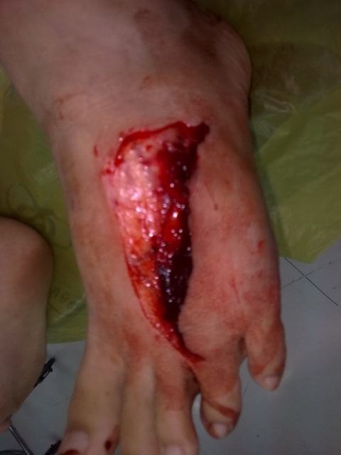Sau cú lướt ngọt, nắp pô chiếc Air Blade cứa một đường dài hơn 10cm vào bàn chân của bé khiến máu tuôn xối xả. Kết quả chụp X quang cho thấy bé gái bị đứt gân co duỗi, gãy hai xương bàn chân.
