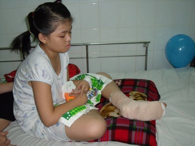 Ngay lập tức, chị băng bó rồi đưa con đến Bệnh viện huyện Hóc Môn. Sau khi sơ cứu, bé được chuyển lên Bệnh viện Nhi Đồng 2. Kết quả chẩn đoán hình ảnh của bác sĩ cho thấy chân trái của H.L. bị gãy hai xương bàn số 4, 5 và đứt gân duỗi.