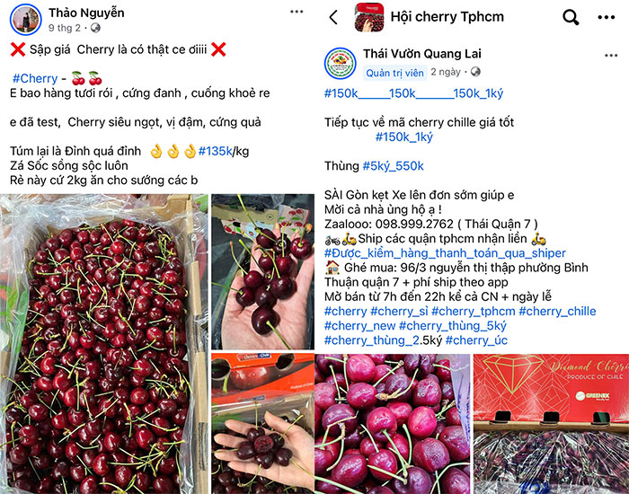 “Choáng” nhất có lẽ là giá cherry. Trước Tết Nguyên đán, nhiều siêu thị bán cherry Chile với giá chưa tới 200 ngàn đồng/kg. Giá này được cho là thấp hơn bình thường 20-30%. Tuy nhiên thời gian gần đây, nhiều người bán hàng online đang rao bán cherry Chile với giá chỉ hơn 100 ngàn đồng/kg… Chẳng hạn như tài khoản Hồng Phạm đang rao bán trên mạng cherry size lớn (XL) với “giá siêu rẻ và chất lượng thì siêu ngon”. Theo đó, 1kg cherry có giá 130 ngàn đồng. Hay như tài khoản Thảo Nguyên với giá bán 135 ngàn đồng/kg nhưng cam kết “cherry siêu ngọt, vị đậm, cứng quả, hàng tươi rói…”. Trong “Hội cherry TP.HCM”, tài khoản Thái vườn Quang lai (địa chỉ shop 96/3 Nguyễn Thị Thập, P.Bình Thuận, Q.7) rao bán cherry Chile giá 550 ngàn/thùng 5kg (tương đương 110 ngàn đồng/kg).
