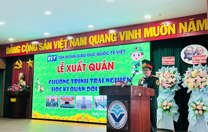Phát biểu tại buổi lễ, TS. Nguyễn Thị Huệ – Chủ tịch Hội đồng quản trị, Tổng Giám đốc Tập đoàn Giáo dục quốc tế Việt – chia sẻ chương trình năm nay có nhiều đổi mới cả về nội dung lẫn hình thức, nhằm mang lại trải nghiệm thực tiễn, hấp dẫn cho học sinh. Bà nhấn mạnh: “Chúng tôi mong muốn các em không chỉ có một kỳ nghỉ hè ý nghĩa, mà còn được rèn luyện bản lĩnh, thể lực, đạo đức và tác phong theo phong cách Bộ đội Cụ Hồ”.