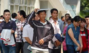 Phụ huynh dù có sốt ruột cũng đừng nên gọi điện thoại liên lạc với thí sinh khi chưa có chuông báo hết giờ làm bài. Ảnh chụp cảnh phụ huynh đợi con trước HĐT Trường ĐH Sư phạm kỹ thuật TP.HCM trong đợt 2 |