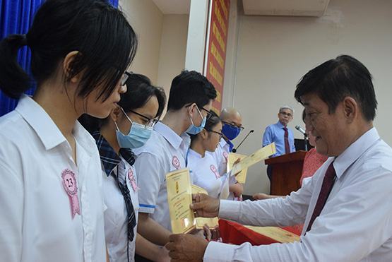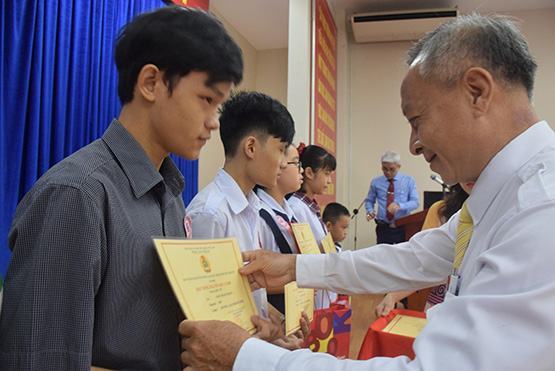 Ông Nguyễn Tiến Đạt – nguyên Phó Giám đốc Sở GD-ĐT TP trao học bổng cho học sinh