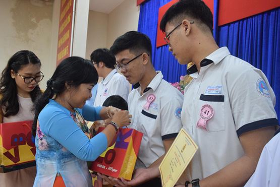 Bà Nguyễn Thị Gái – Chủ tịch Công đoàn giáo dục TP trao học bổng cho học sinh
