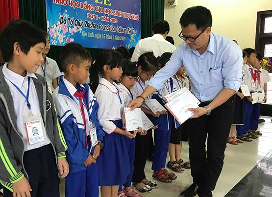Được biết dự án trao học bổng cho HS nghèo ở địa bàn tỉnh Quảng Trị được Zhishan thực hiện từ năm 1998, với mục đích hỗ trợ các em tiếp tục đi học và hoàn thành các cấp học. Dự án bảo trợ cho các em HS từ bậc tiểu học đến khi tốt nghiệp ĐH, CĐ. Nội dung hỗ trợ bao gồm học bổng 12 tháng, phần thưởng cho HS khá, giỏi, cấp dụng cụ học tập, đồng phục, bàn ghế, đồ dùng cá nhân như chăn, màn, áo ấm mùa đông… Bình quân hỗ trợ 2,1 triệu đồng/ em/ năm học.