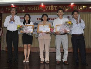 Ông Lê Hồng Sơn – Giám đốc Sở GD-ĐT TP.HCM (bìa trái) cùng đại diện nhà tài trợ (Công ty Du lịch Thương hiệu Việt) trao thưởng cho ba tác giả đoạt giải nhất, nhì, ba. Ảnh: Q.Huy |