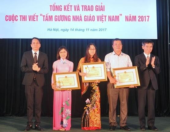 Sáng 14-11, Bộ GD-ĐT phối hợp với Công đoàn Giáo dục Việt Nam tổ chức tổng kết và trao nhiều giải thưởng cuộc thi viết “Tấm gương nhà giáo Việt Nam 2017”, trong đó có 2 giải đặc biệt, 2 giải nhất, 4 giải nhì, 8 giải ba và 24 giải tư cho các tác giả.