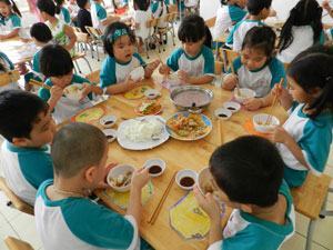 Còn tại Trường MN 19-5, Q.8, việc đổi mới tổ chức bữa ăn được thể hiện rõ nét nhất ở các lớp lá. Ngày 11-10, bữa ăn của các bé lớp lá (5 tuổi) có ba món: canh, mặn và rau. Ở lớp lá 1, thức ăn được để trên bàn, các bé sẽ tự múc. Tùy vào nhu cầu của bản thân mà các bé lấy thức ăn ít hay nhiều. Ở lớp lá 2, các bé ăn cơm ở dĩa, bên cạnh là một chén canh, một chén nước tương. Ở lớp lá 3, bữa ăn của bé được tổ chức như bữa ăn gia đình. Mỗi một bàn từ 6-8 trẻ là một gia đình. Trên bàn bày đầy đủ thức ăn và cơm, các bé tự xúc cơm, gắp thức ăn, rau và múc canh. Các bé ăn dùng đũa chứ không phải muỗng như thông thường… Cách tổ chức này khiến các bé rất thích thú mỗi khi đến giờ ăn và các bé cũng ăn được nhiều hơn.