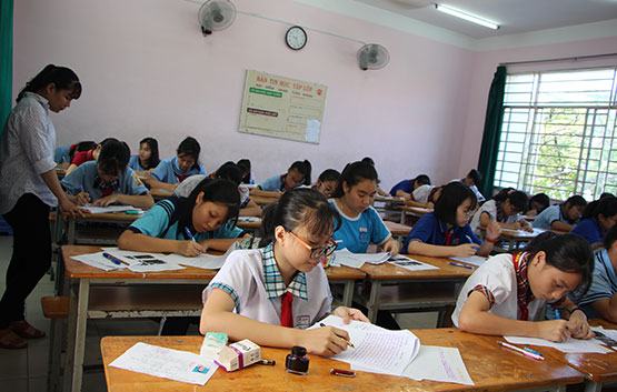 Các em học sinh đang làm bài văn