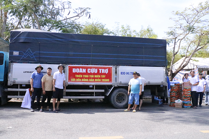 … Dưới nắng gắt, hàng trăm tình nguyện viên tất bật với công tác cứu trợ. Khi chốt lại “Đoàn cứu trợ – triệu trái tim miền Tây gửi đến đồng bào miền Trung” bao gồm 13 xe các loại, tải trọng từ 2,5 tấn đến 9 tấn, trong đó có 2 xe container, 1 xe cứu thương, 1 xe chở 2 ca nô để đoàn đến những vùng sâu đưa đồ tận tay bà con. Các xe đều do các doanh nghiệp miền Tây tình nguyện tham gia, bố trí tài xế kèm theo xe.