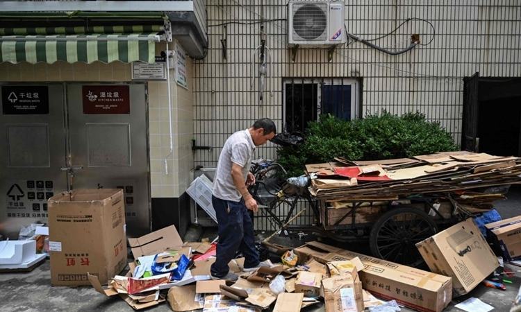 Một người đàn ông Trung Quốc tại điểm tập kết rác ở Thượng Hải ngày 11/7. Ảnh: AFP.