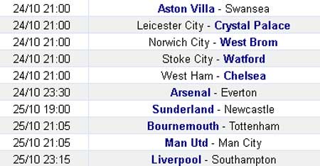LỊCH THI ĐẤU VÒNG 10 PREMIER LEAGUE